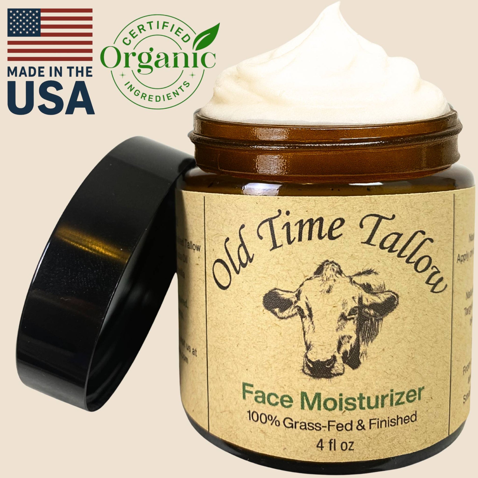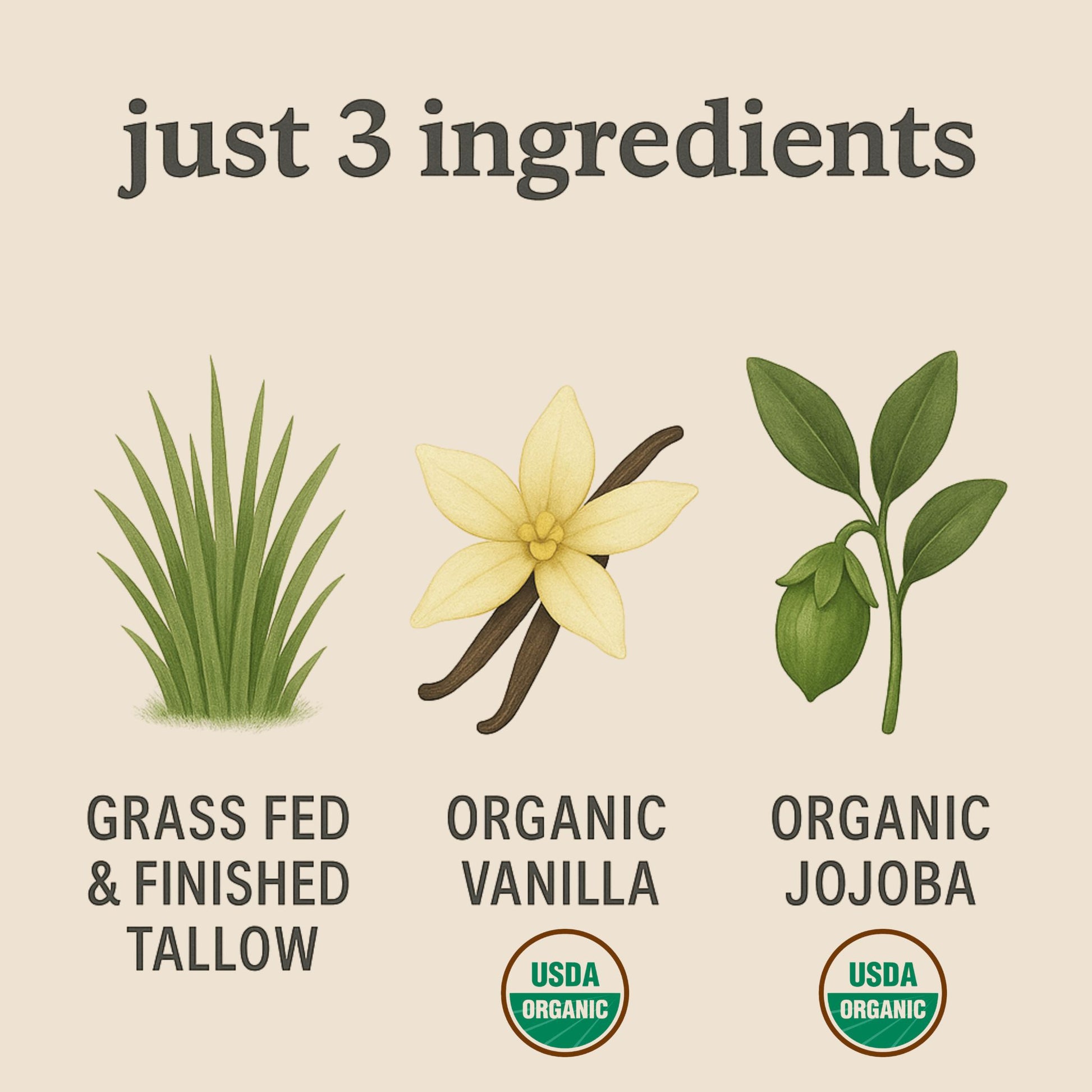 Clean & Natural — We use only USDA certified organic ingredients and 100% grass-fed, grass-finished tallow from cows born, raised, and regeneratively pastured right here in the USA. Free from man-made “Franken-foods” — non-GMO, with no preservatives, artificial fragrances, gums, additives, fillers, corn, or soy. Just clean, natural ingredients.