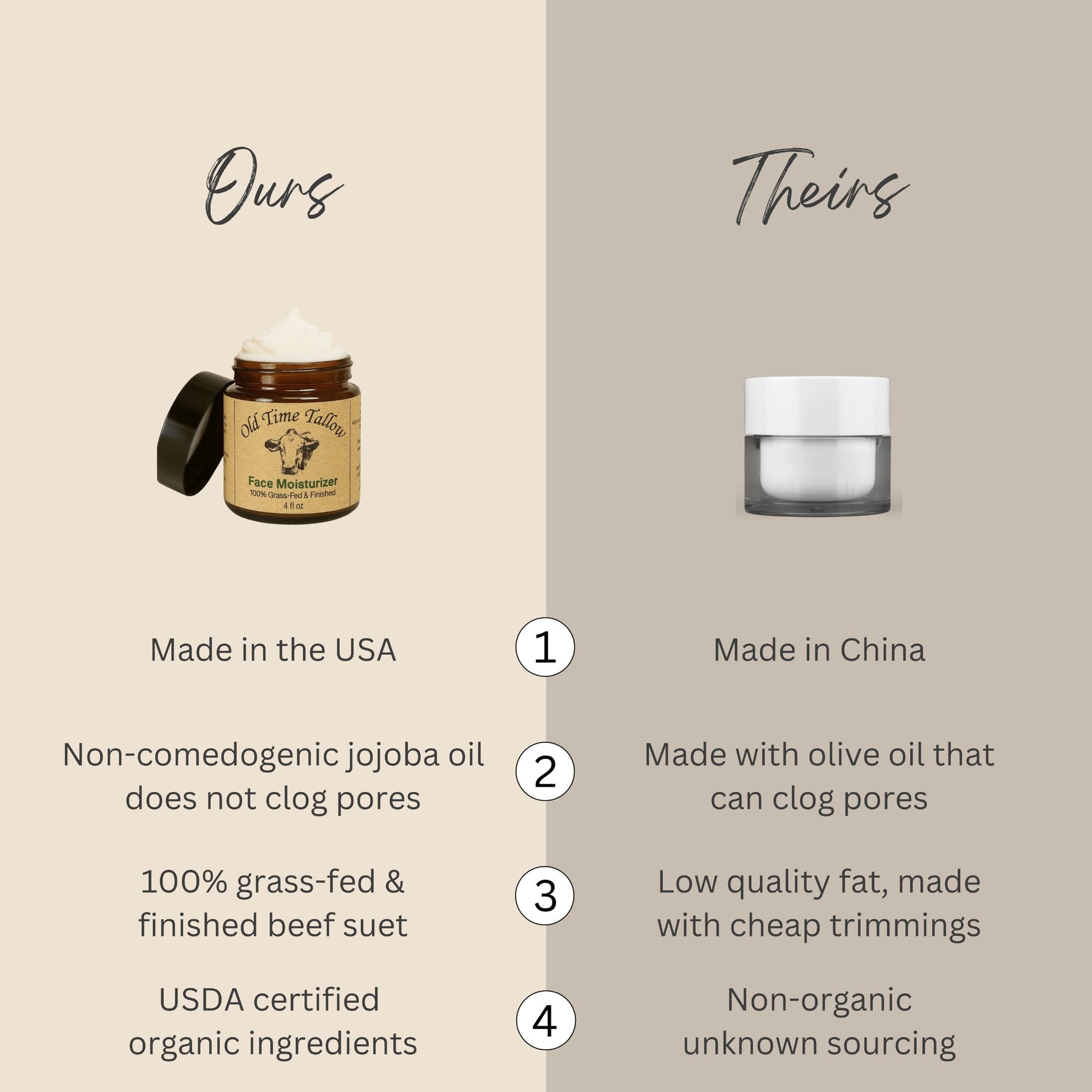 Old Time Recipe — Made with traditional, slow rendering methods; Our vitamin-rich moisturizer deeply nourishes and hydrates. Tallow closely mimics your skin’s natural protective layer (sebum). This natural compatibility helps it absorb quickly and work well with all skin types.